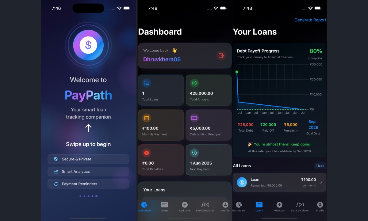 A loan tracker application that helps users in managing their debts. In-built AI functionality that provides the users with strategies on being debt free and paying off their loans. Includes graphs and charts that are useful in visualising loan payoff progress. Various features like EMI calculator, payment schedule generator, and report generator. Biometric authentication enabled in the app for enhanced security and privacy.