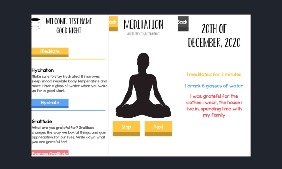 An application that motivates users to find things to be grateful for. It allows the user to meditate with over 30 unique songs, picked randomly. It sets a goal for the user to drink water, which is one of the most underlooked aspects of one's life.